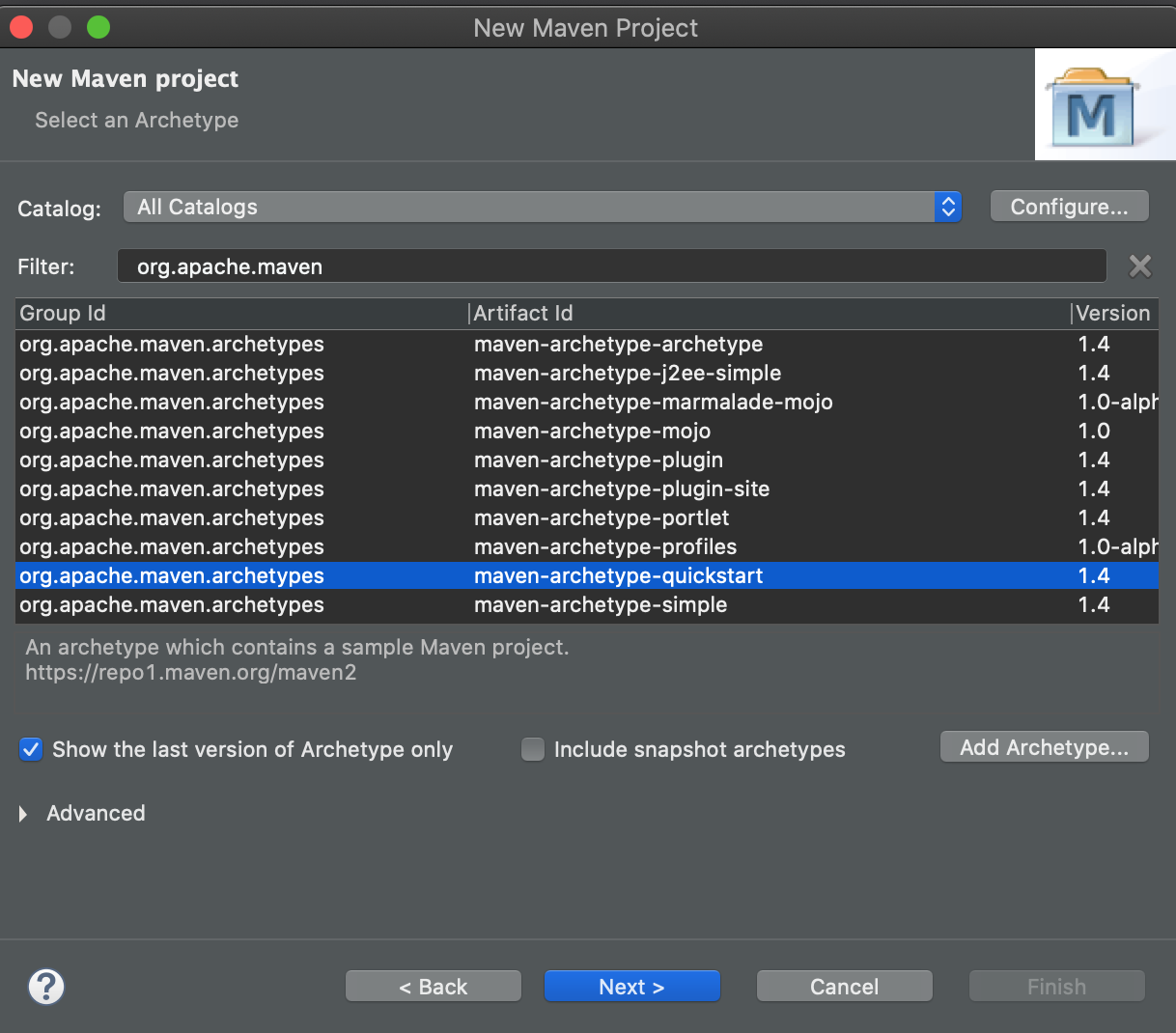 maven-archetype-quickstart를 선택하고 next버튼을 클릭한다.
