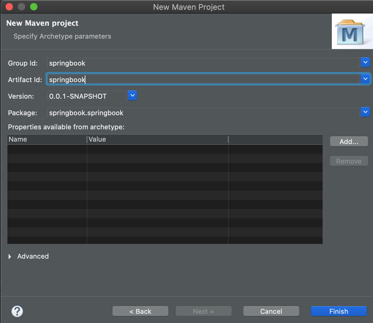 다음과 같이 Group Id와 Artifact Id를 주고 Finish버튼을 클릭한다.
